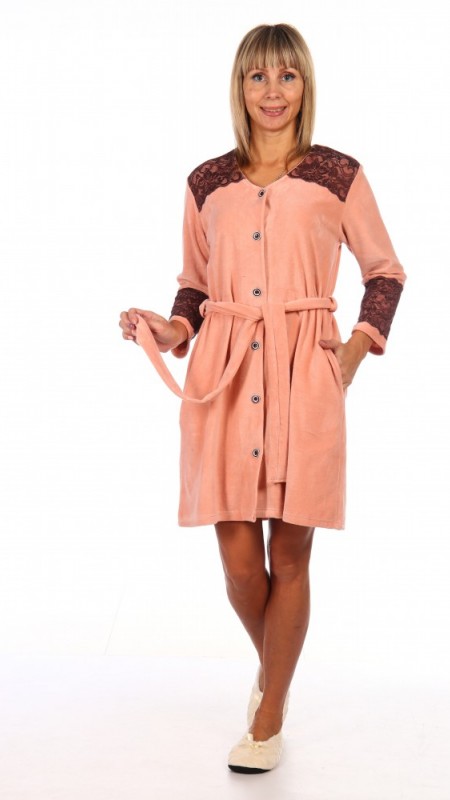 Халатик на пуговицах свободного кроя, с длинным рукавом ,на поясе, кокетка и рукава украшены кружевом.