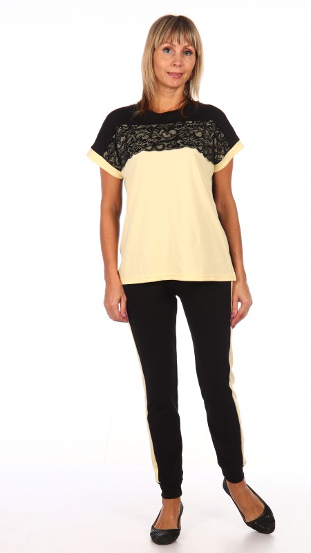 Стильный брючный костюм . Кофта свободная , чуть приталенная, кокетку украшает нежное кружево ,брюки на манжете,с лампасами.