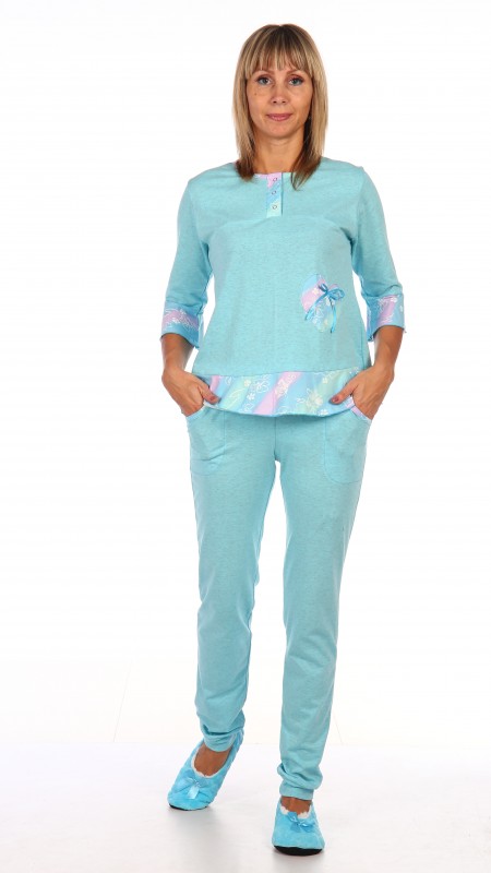 Женская пижама с брюками. Кофта свободная,на полочке планка с тремя клепками,рукав три четверти украшен воланом из ткани компаньона нежного цвета. Брюки на манжете, с карманами.