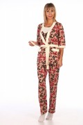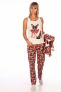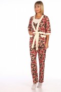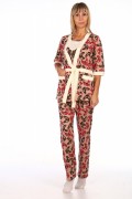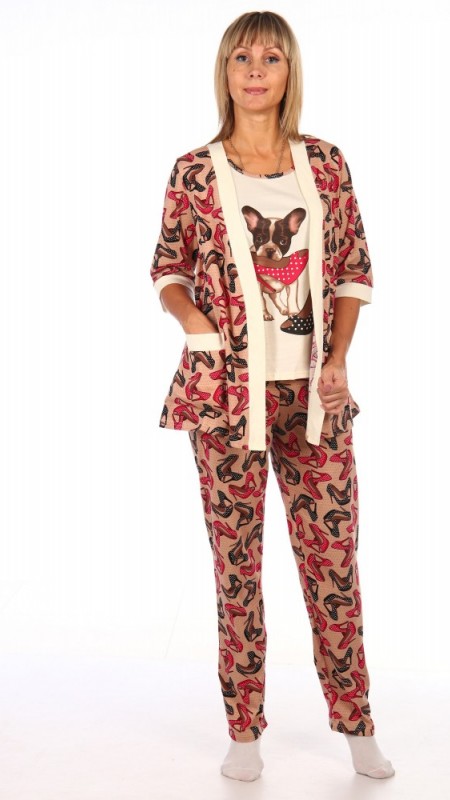 Коплект состоит из прямых брюк и майки,украшенной принтом ввиде собаки. В коплект входит укороченный пеньюар на поясе.