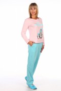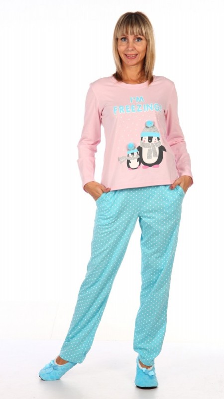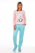 Нежная пижама с брючками, кофточка цвета клубничного мороженого украшена принтом-пингвин ,брюки из ткани компаньона.