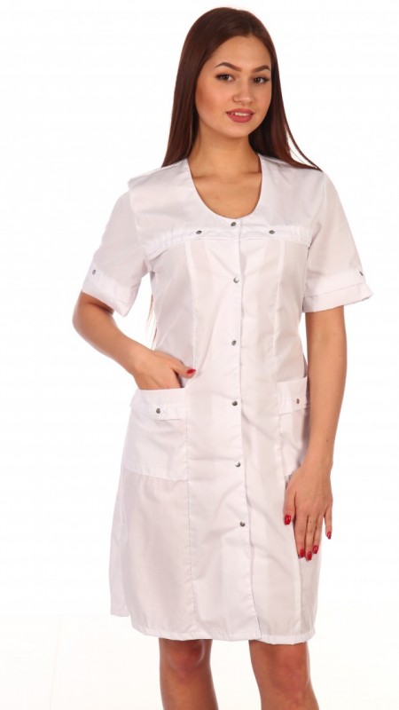 Халат удлиненный приталенного силуэта с центральной застежкой на кнопки. Полочка с рельефными швами, боковыми карманами, О-образной горловиной. Рукав прямой выше локтя. На спинке рельефные швы и полупояса, которые регулируют объем халата. На передней полочке и планке рельефная отделка с кнопками. Практичен и удобен в использовании. Предназначен для медицинских работников.