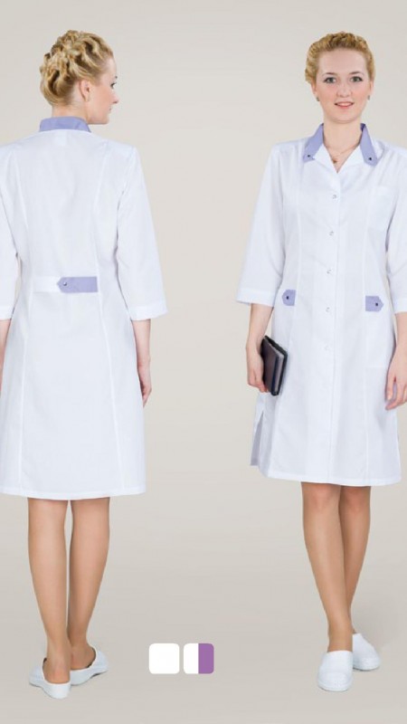 Халат женский прилегающего силуэта с центральной бортовой застежкой на кнопки. Воротник стояче – отложной, переходящий в отложные лацканы. Рукав ¾. Два нижних накладных кармана. Стойка, верхний хлястик спинки, паты карманов выполнены из отделочных тканей