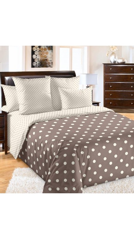 Комплект состоит из тканей компаньонов.Пододеяльник темный с рисунком горох с 2х сторон,простыня и наволочки светлые с рисунком горох.